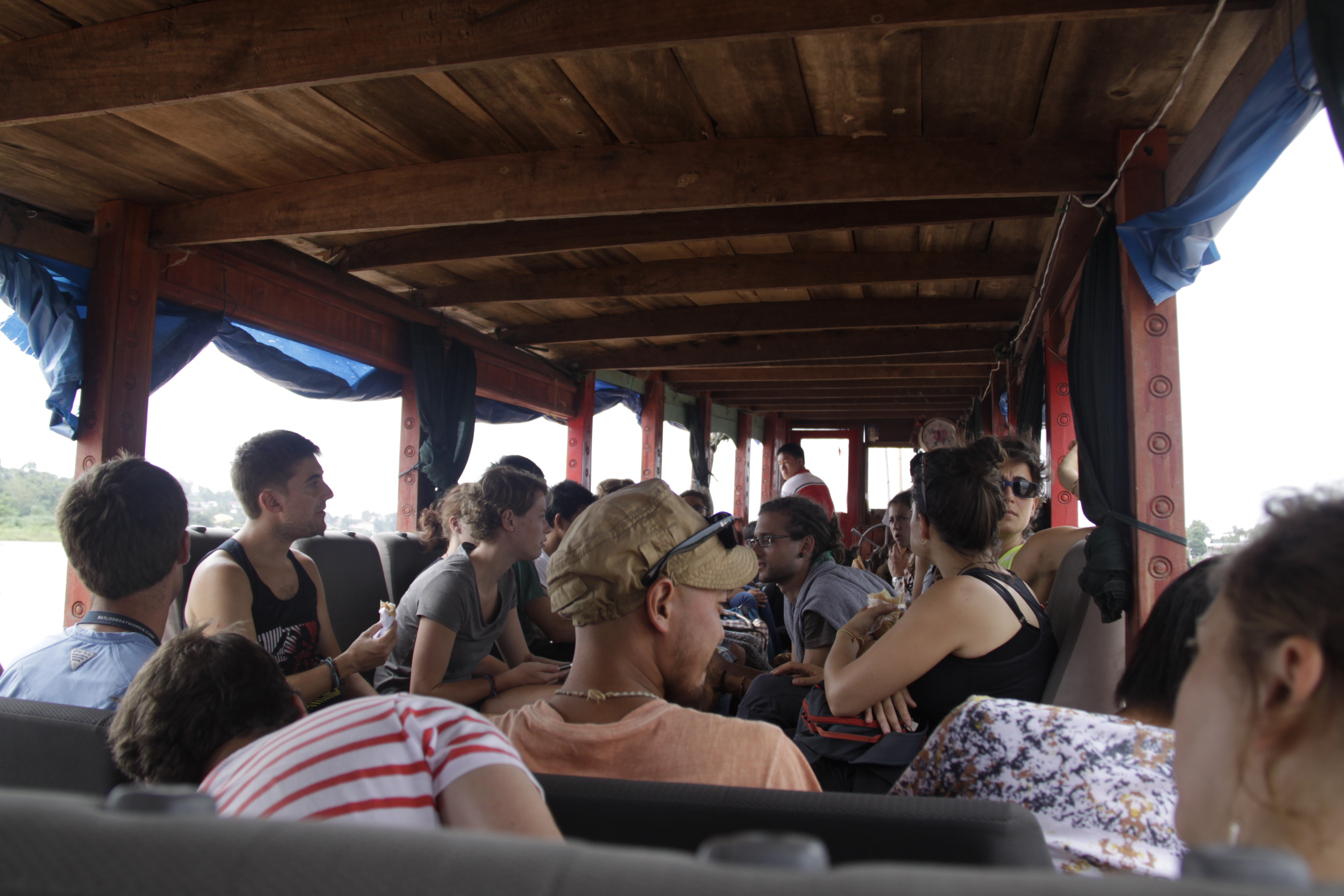 The border crossing takes a while so remember to pack your patience. Once through the Thai border there is a bus (20 baht) to take you to the visa control. There are also money changes here so you can get some kip. After all the paperwork is done you are squished into minivans to take you to where the boats leave. By the time the boat left I felt like I’d already done a full days travel.