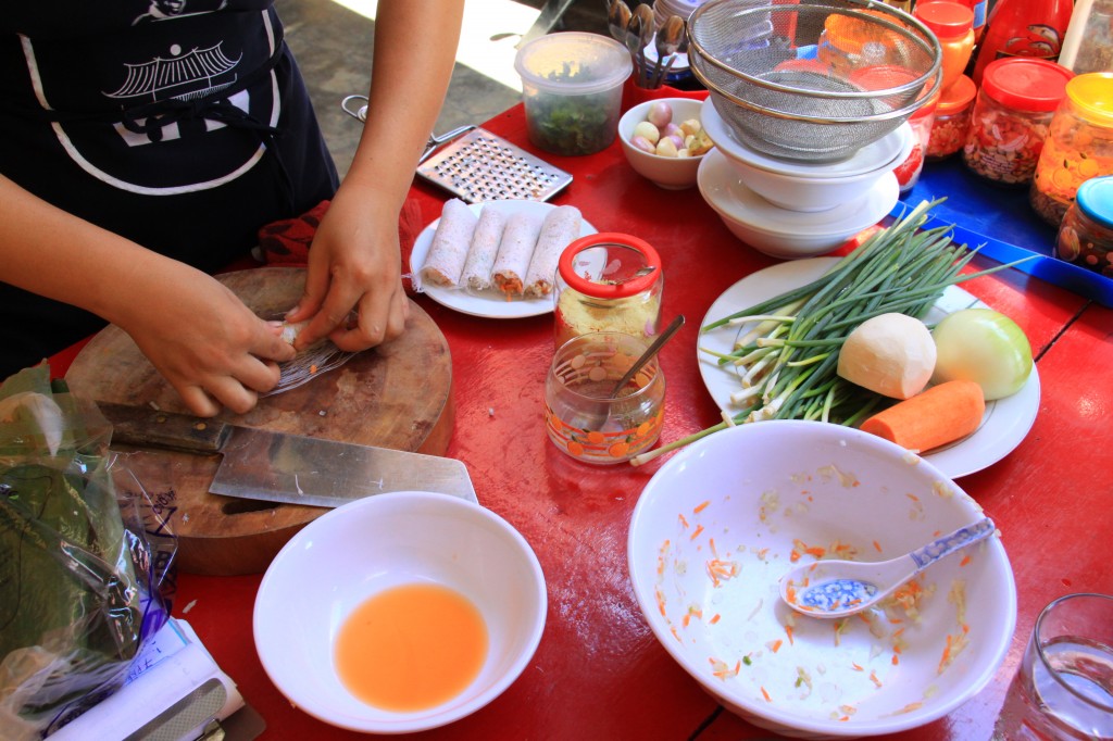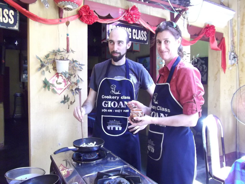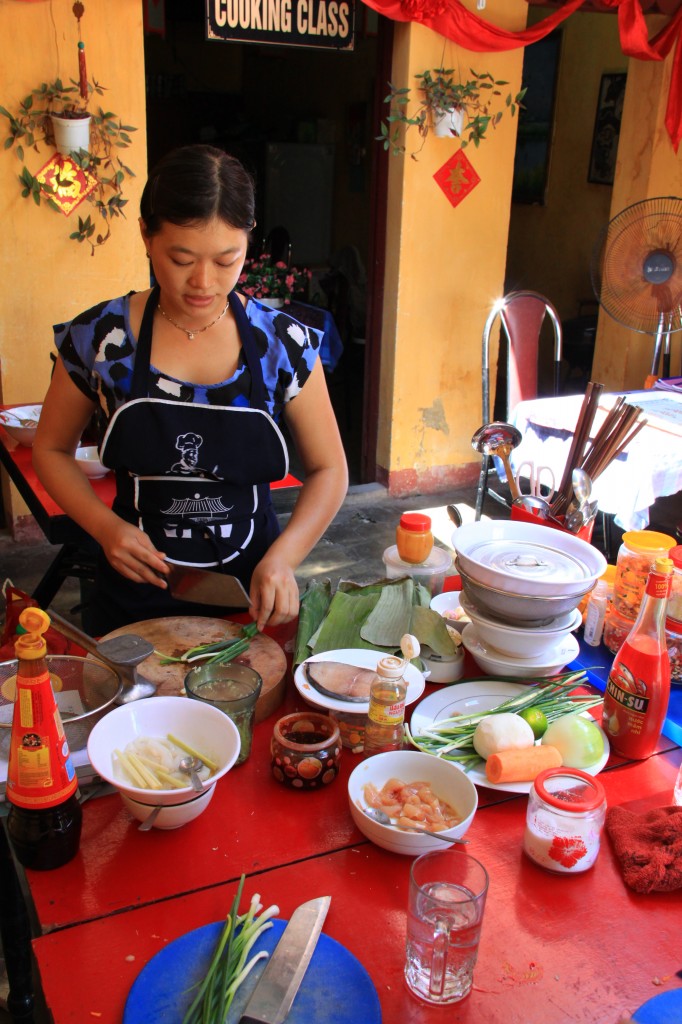 We had been keen on doing a cooking course while we were and holiday and finally settled on a class run by the Gioan Restaurant. The owner was very friendly and we got to choose 4 dishes that we wanted to cook. We decided on Fried Spring Rolls, Pho, Chilli and Lemongrass Squid and Fish in Banana Leaf.